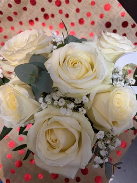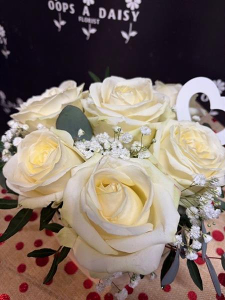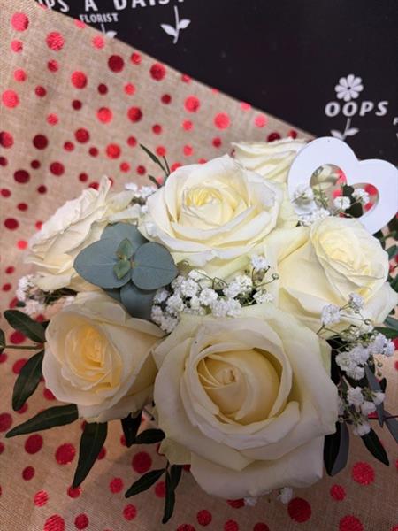 6 white roses in heart box.. all roses are cut short and in oasis.