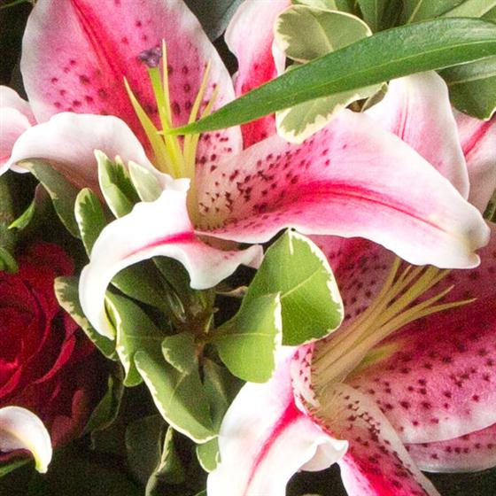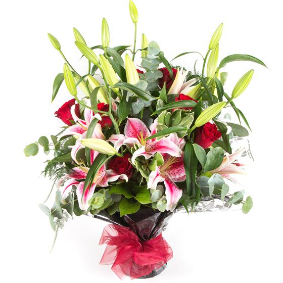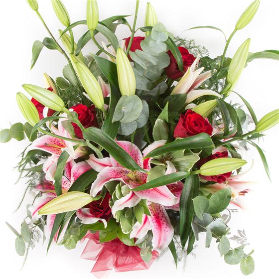 A highly scented, beautiful hand-tied bouquet of velvety red roses and pink lilies.