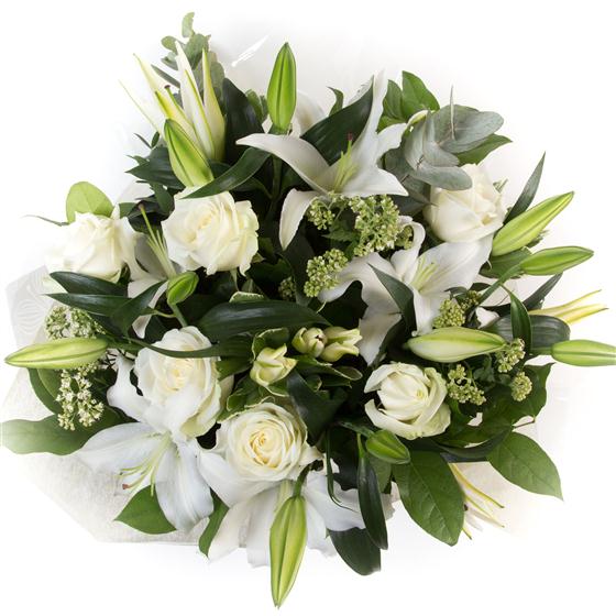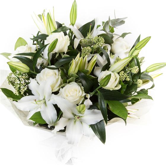 A fragrant hand-tied bouquet of oriental lilies and white roses mixed with foliage. Lily’s will not be fully opened as they are just in fresh.