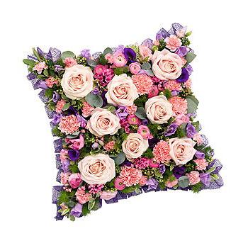 A beautiful pink, mauve and purple cushion featuring pink Roses, Ranunculus, Bouvardia and Carnations with lavender and purple Lisianthus. A mix of Eucalyptus, Ming Fern and variegated Pittosporum completes the design.